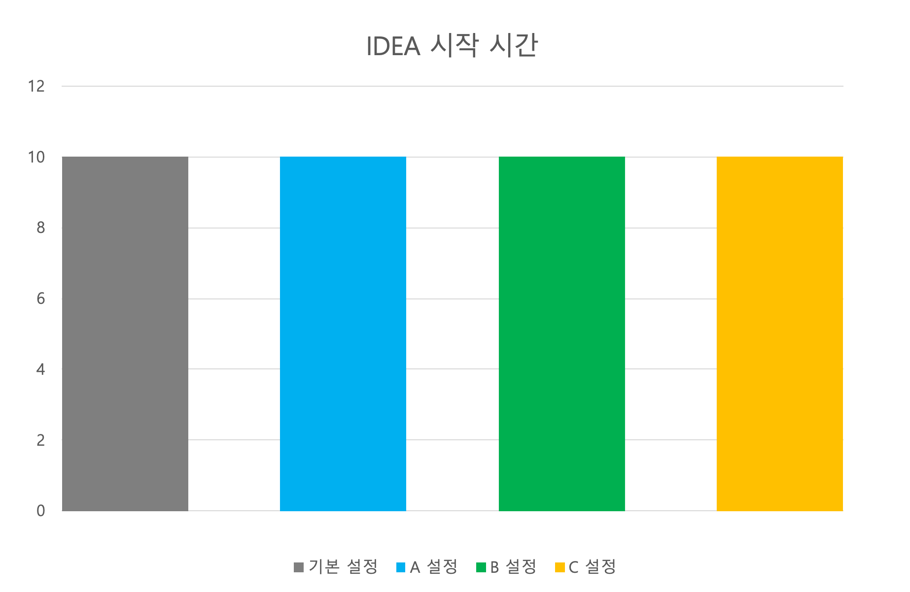 - IDEA의 시작 시간은 메모리 설정에 따른 변화가 없는 걸 볼때 메모리에 의존적이지 않는 것을 확인할 수 있습니다.
